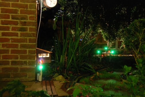 The DLR at night with the signal lights shining out well. The lights are white LED set behind thin coloured filters. |