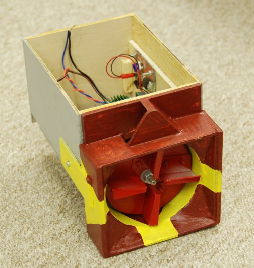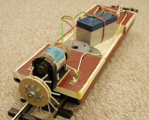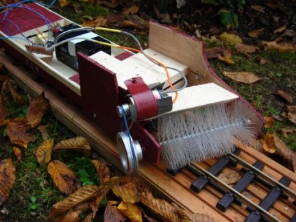 The 12V motor uses a reduction gearbox and the leave "flicker" wizes round at about 2500rpm and when it encounters a leaf propels it off the track. The OD of the flicker is 90mm but I am thinking of building as bigger MKIII version with a flicker of 110mm and having the motor articulated by the bogie, to follow the track, so that the problem currently encountered of the flicker bashing the track on tight corners is much lessened or negated. |