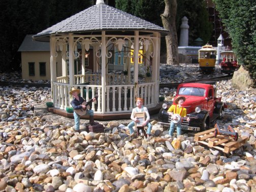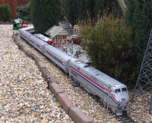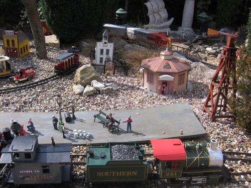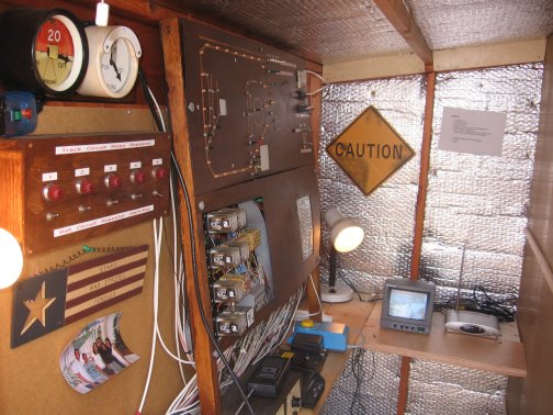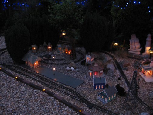 Technical Aspects of The Hayes Valley RailroadOnce I had started the railway, albeit with just a circle of track over the pond and passing loop my thoughts immediately moved towards integrating electronics and greater control into the railway. It has taken many years to get to the stage the control on the railway is now, mainly through trial and error and the odd blown fuse! The control shed/signal box has a special supply from the house fuse box of 20 amps, this is then connected to a fuse box in the shed with an RCD, and this feeds a 16 amp power circuit and 6 amps for lighting. The main shed actually has in it about 25 mains sockets to power each transformer/other sheds/lights etc! There is also a separate supply of 110 volts for the American lighting around the garden. The railway has a number of transformers to suit each need. Two Gaugemaster controllers are used, one as a back up supply and another to control the tram/town line, these also supply the track circuit relays with 24 volts DC and the point and signal motors. A toroidal transformer supplies twice, 18 volts DC at 5 amps for the main track and also all the power for the lighting and accessories. There is also a special "split rail" power supply for the bell blocks and block instruments. The railway has approximately 10Km of multicore and power cabling around it! The first thing I wanted was lighting for all the buildings and station lamps/lamp standards. This is a nice touch because at night it looks great especially with all the other lighting in the garden. These are strings of lights brought over from America and give the railroad that American feel, all lit up red, white and blue, although they do require a 110volt power supply. |