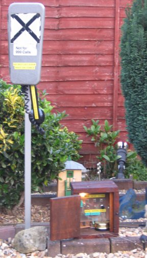 Recently a telephone link has been added between the signal box and the main station across the garden. The station has an original railway trackside telephone in its metal case and this is connected to a vintage 1920s Bakelite telephone in the shed. Either phone can ring the other one to call attention and allow communication between two operators. |