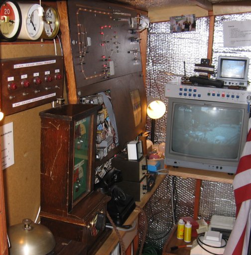 One of my main interests is television operations and to this end the garden is fitted out with 2 cameras to keep a check over the railway and also 2 wireless cameras. These are fed into a 9 input 2 output switcher-box which allows two separate video outputs, one feeds a monitor in the signal box and the other feeds a flat screen TV in another shed window to allow visitors to get a view of what is happening. One wireless camera is fitted on to one of the station buildings and gives a lovely scale view of "waiting at the platform" and shows the passing trains. The other is fitted to a converted caboose in the cupola and gives a guards view down the train. This is also fitted with high brightness LEDs to allow it to work in low light conditions and also fitted with a battery if track power is not available such as if running live steam or battery power. Future plans may perhaps include a venture into digital control using the MERG home built system and a live web cam of the railway and when working live web cast views from the trains. |